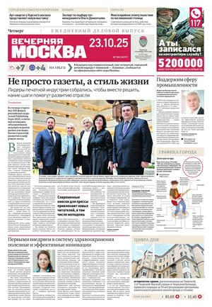 «Вечерняя Москва» — ежедневная российская вечерняя газета, старейшее из вечерних изданий в России, учрежденное в 1923 году. Выходит пять дней в неделю, кроме субботы и воскресенья. Отличается тем, что рассказывает о событиях еще не завершившегося дня. Оперативно освещает хронику и особенности жизни Москвы, охватывает все слои общества и большинство профессиональных и возрастных групп читателей.Издание представлено тремя выпусками – утренним ежедневным, вечерним (выходит три раза в неделю), еженедельным (выходит по четвергам).