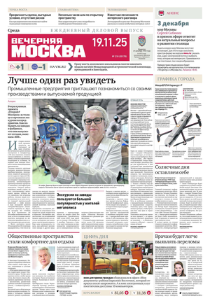 «Вечерняя Москва» — ежедневная российская вечерняя газета, старейшее из вечерних изданий в России, учрежденное в 1923 году. Выходит пять дней в неделю, кроме субботы и воскресенья. Отличается тем, что рассказывает о событиях еще не завершившегося дня. Оперативно освещает хронику и особенности жизни Москвы, охватывает все слои общества и большинство профессиональных и возрастных групп читателей.Издание представлено тремя выпусками – утренним ежедневным, вечерним (выходит три раза в неделю), еженедельным (выходит по четвергам).